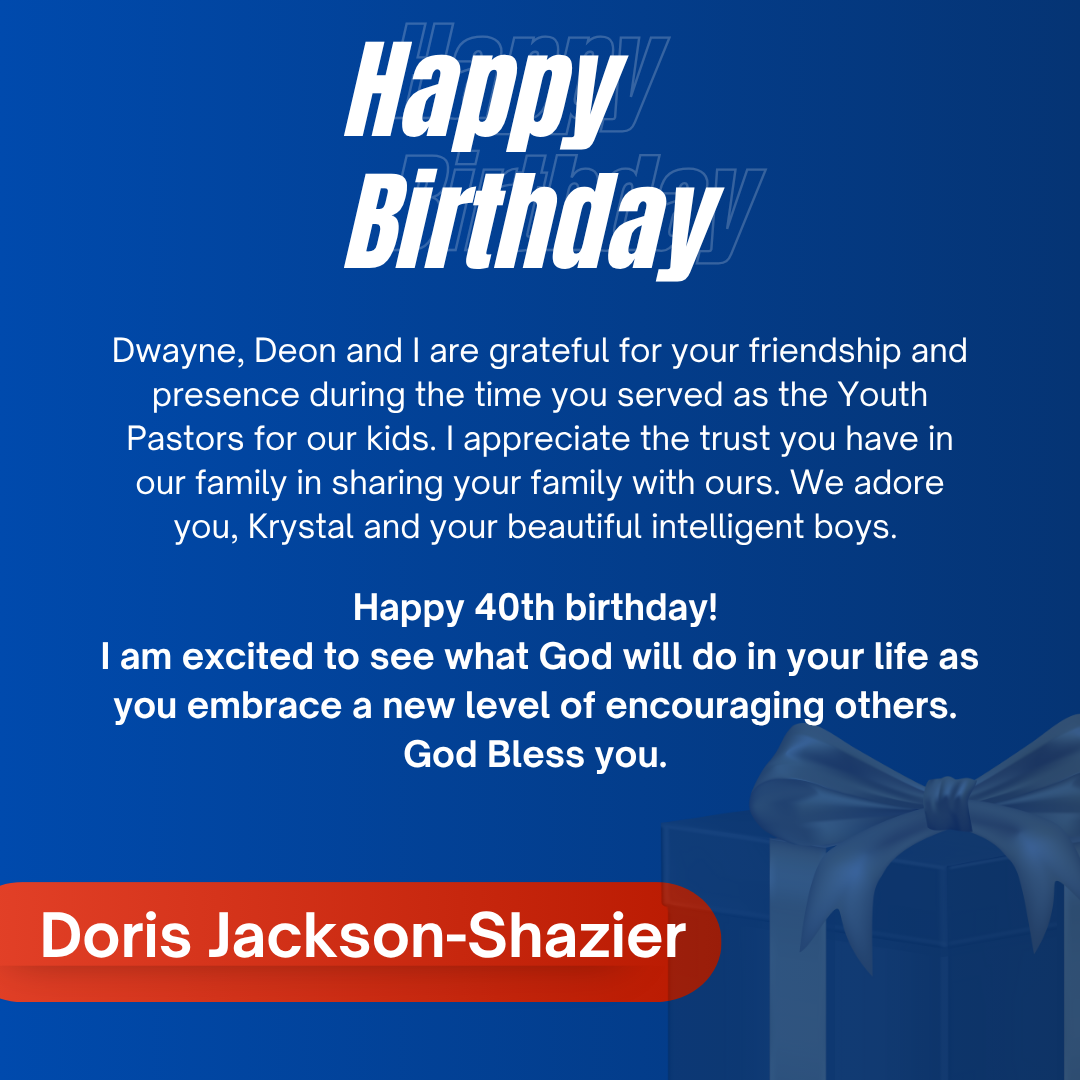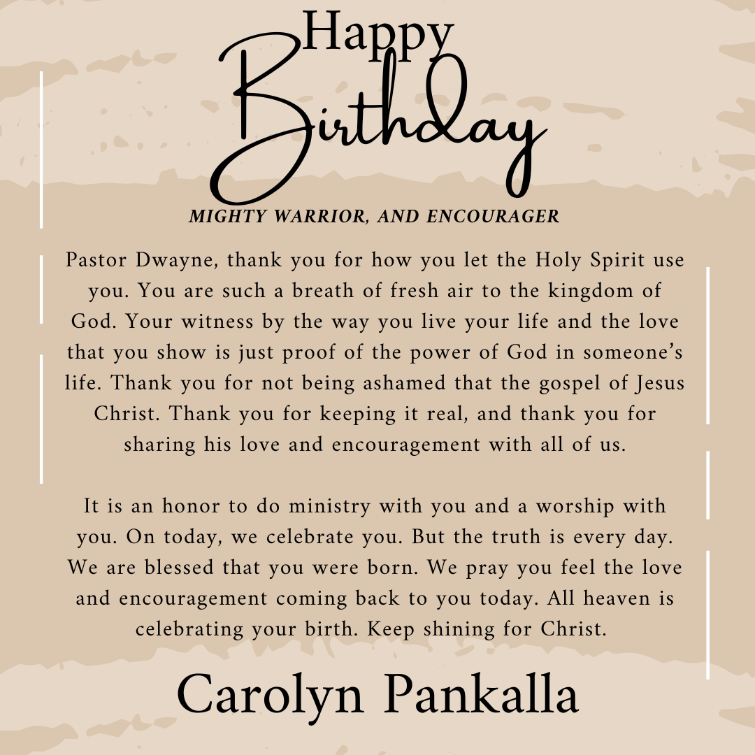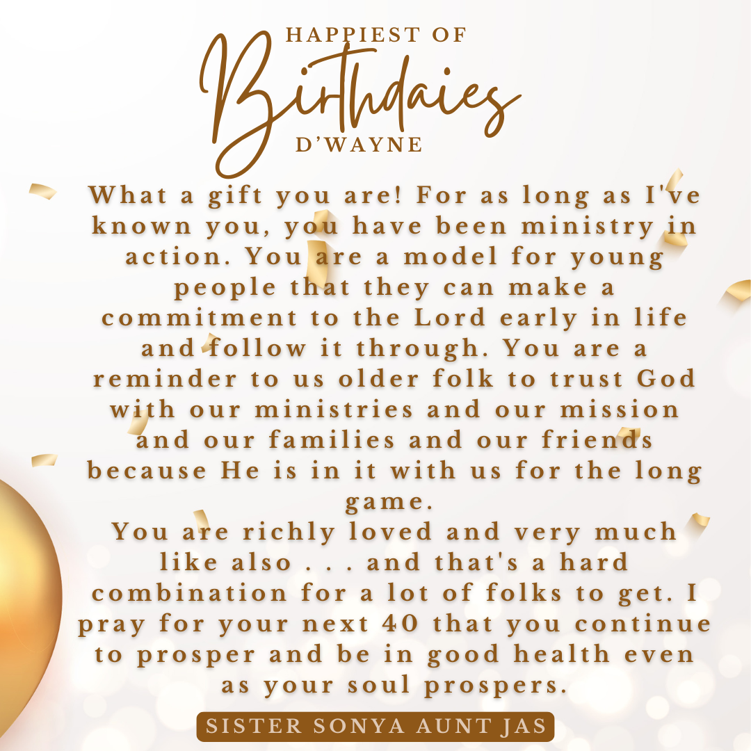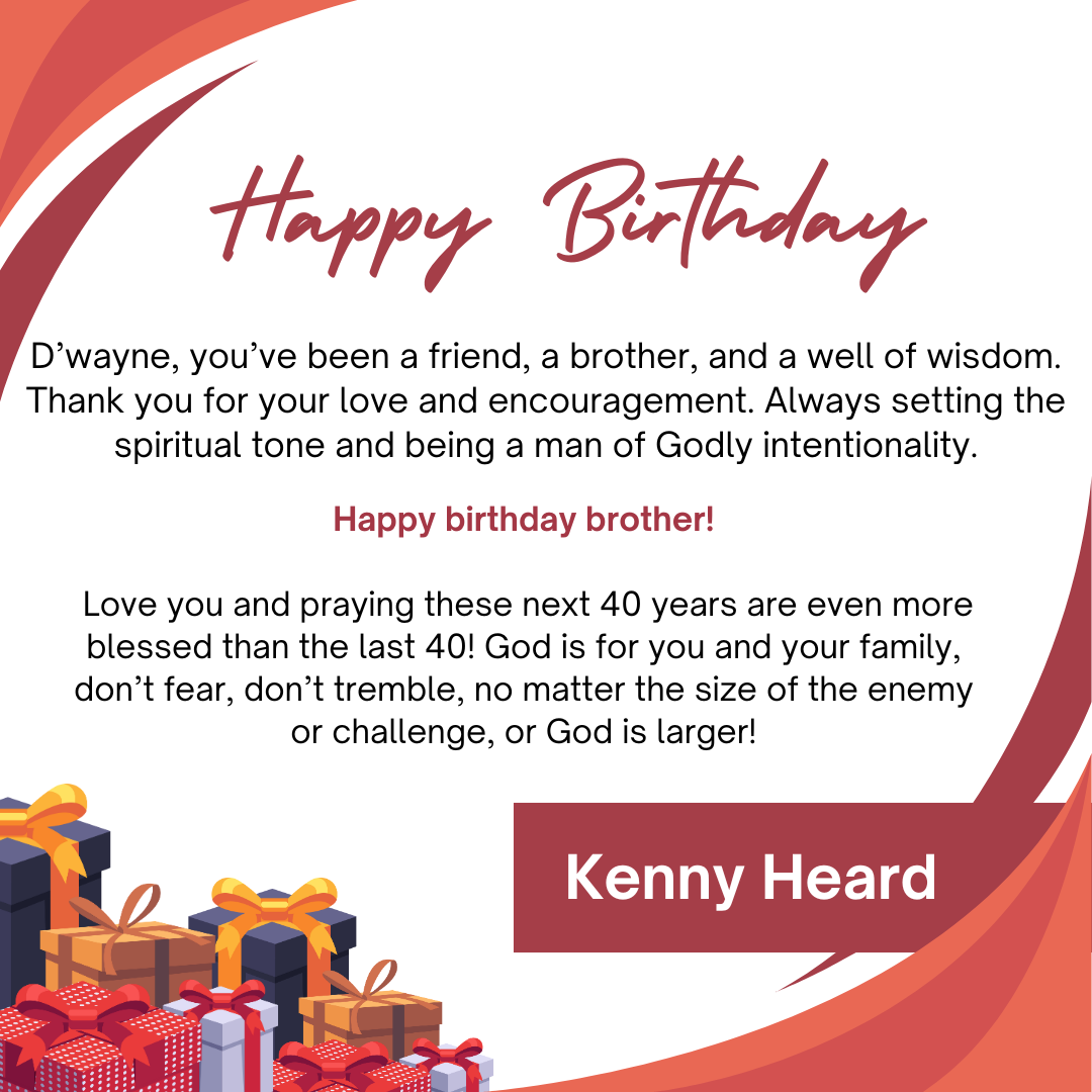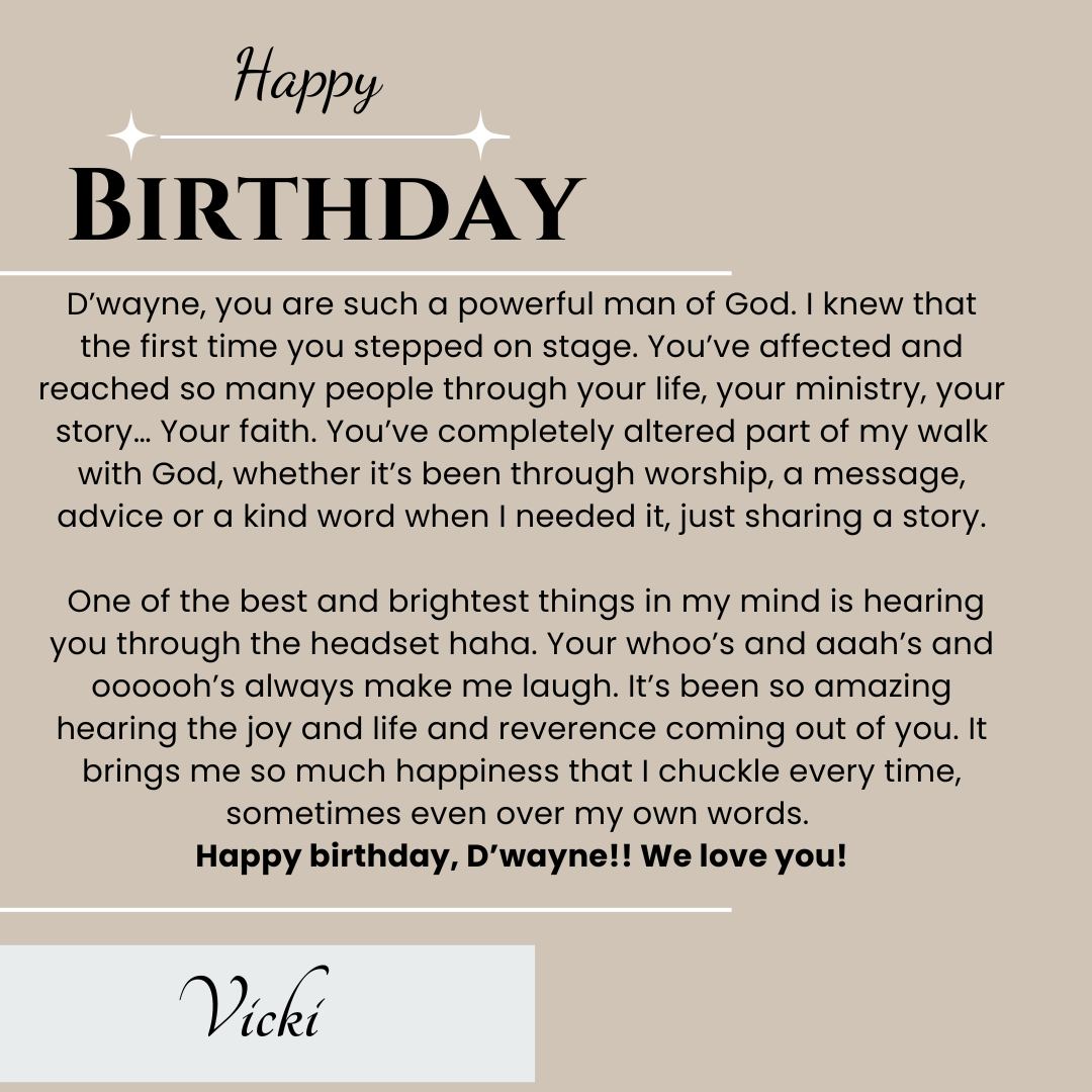 D’wayne, you’ve spent your life pouring out for others. This page is a small glimpse of how much you’re loved in return. Today we celebrate not just your birthday, but the man of God, husband, father, and friend you are.
