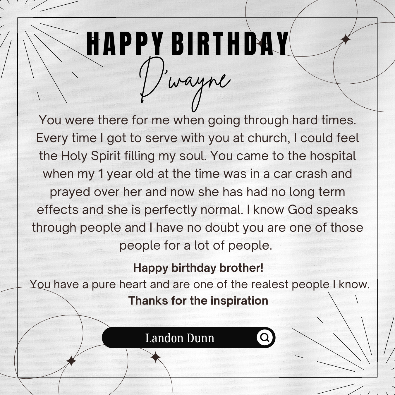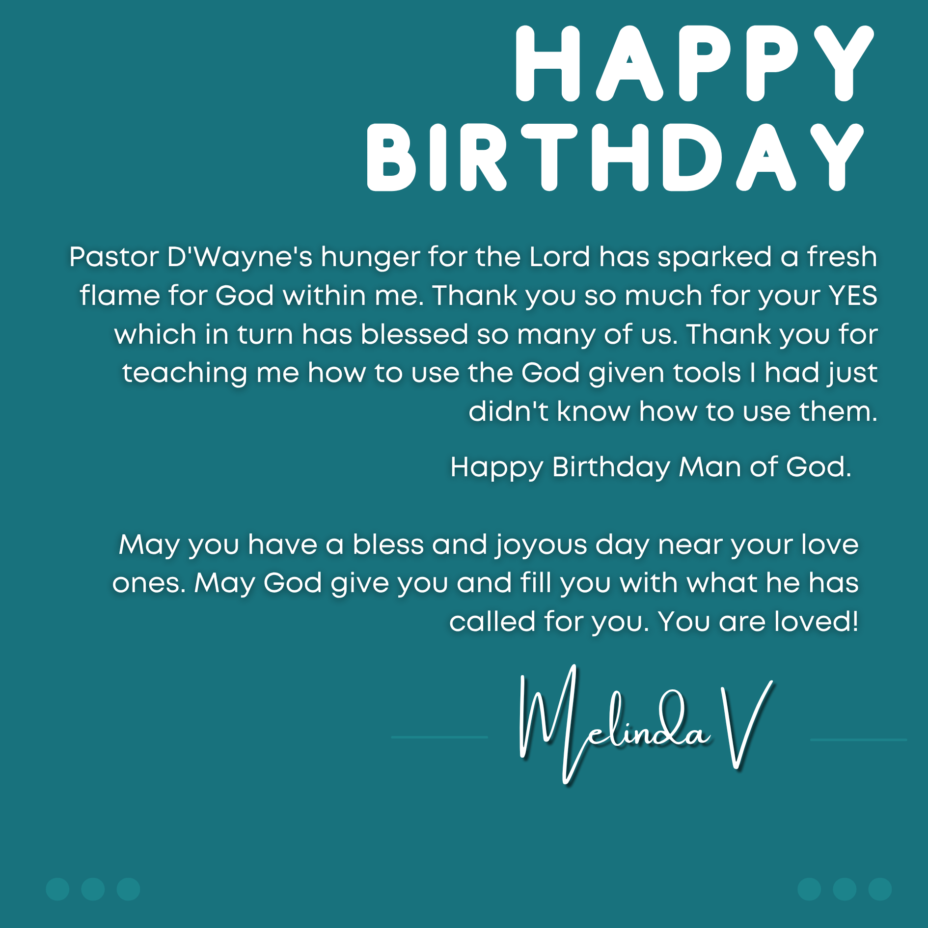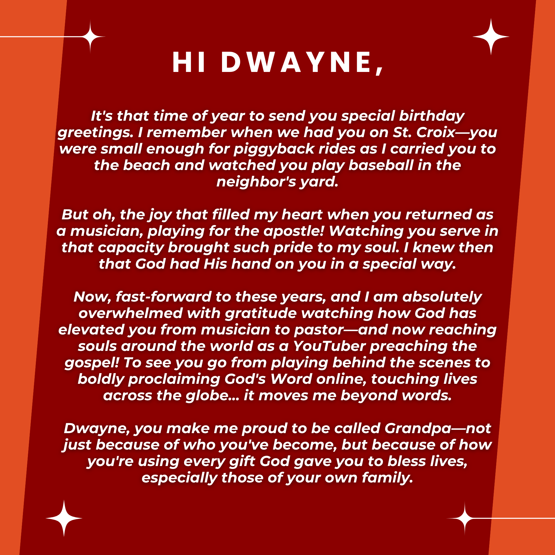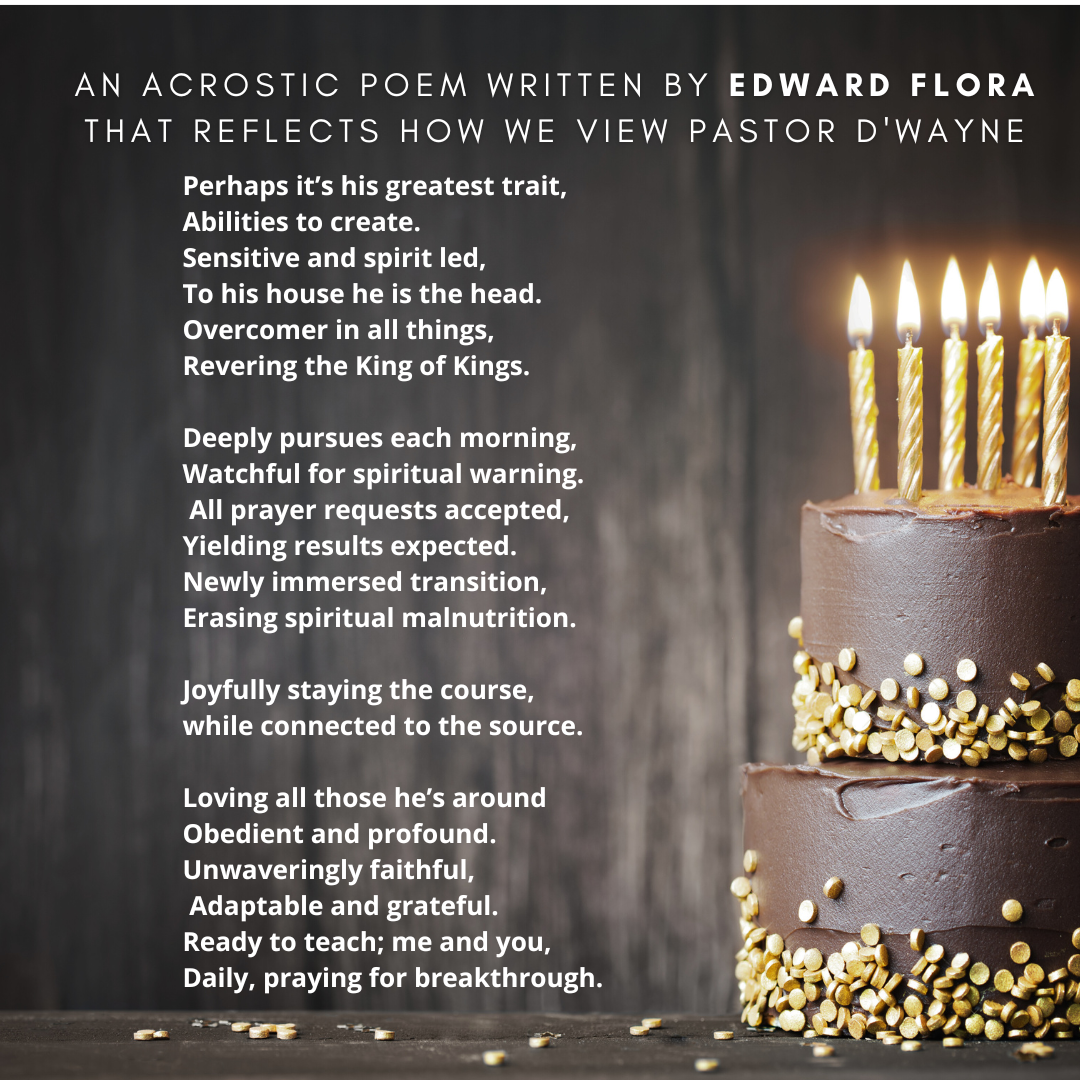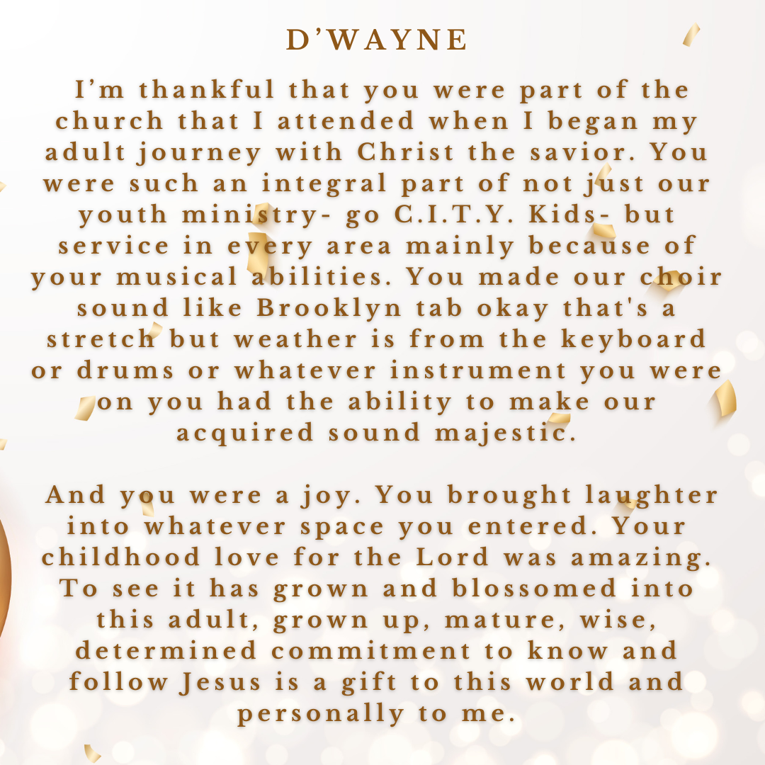 D’wayne, you’ve spent your life pouring out for others. This page is a small glimpse of how much you’re loved in return. Today we celebrate not just your birthday, but the man of God, husband, father, and friend you are.